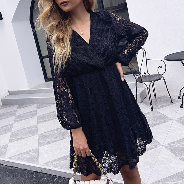 As we all know,the lace element is a good way to exude the femininity. So why not take interest in this lace dress? It is finished with deep v-neck,long sleeve and high waist design,this dress not only can showcase your slender figure,but also can flaunt off your charming side. Just slip into this piece to express your beauty and charm!
