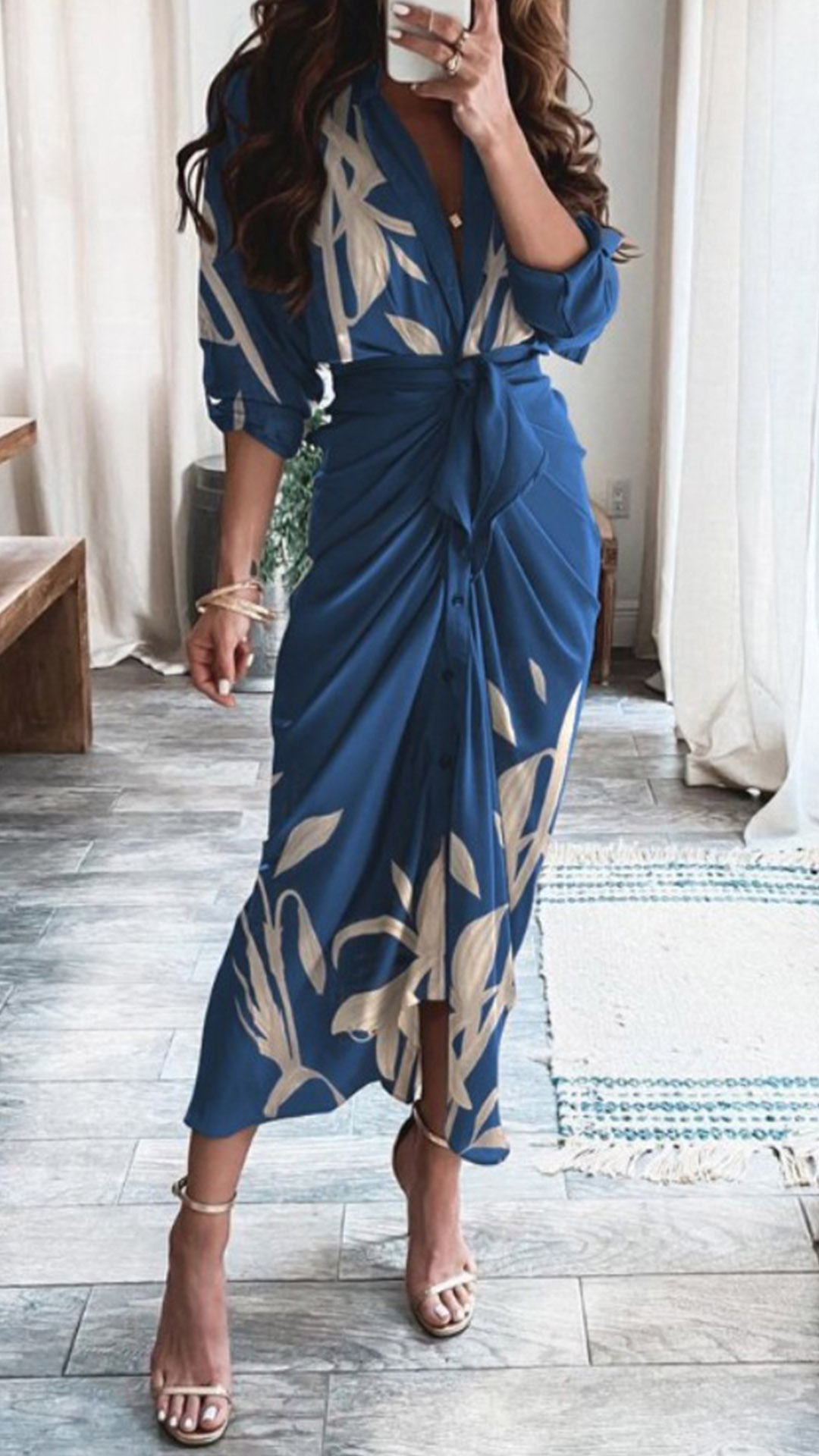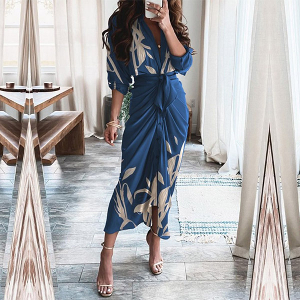 If there is one way to instantly give your image a style boost, it is by introducing this printed shirt dress into your ensemble. The deep v-neck,irregular hem and wrinkled details make this piece look so distinctive and attractive. And the lace-up design at the waist part can better showcase your waistline and figure. You can be a pleasant sight to draw more attention when you wear this dress.