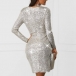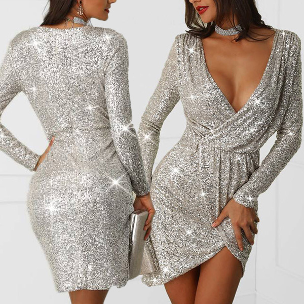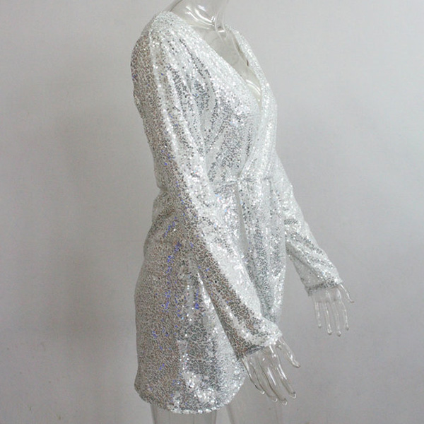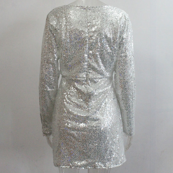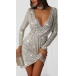 Sexy Deep V-neck Long Sleeve Irregular Hem Slim Fit Sequin Party Dress