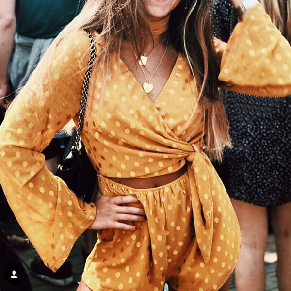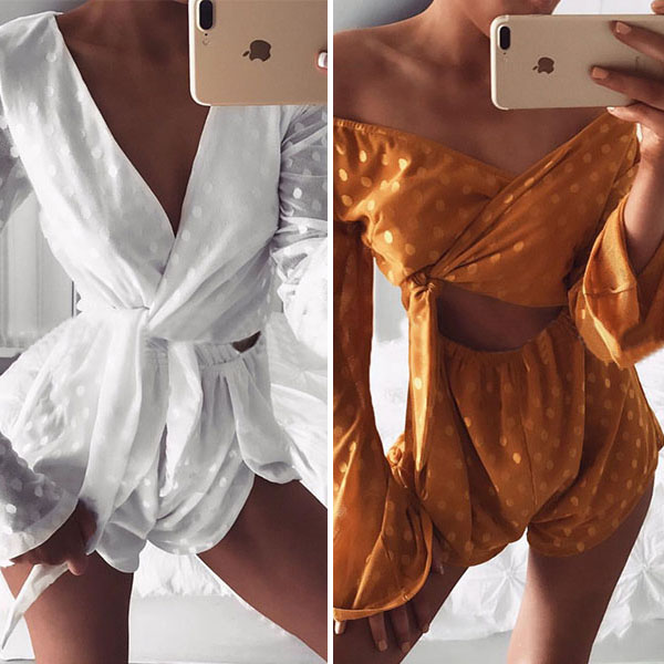 Sexy Deep V-neck Long Sleeve Lace-up Dots Printed Romper