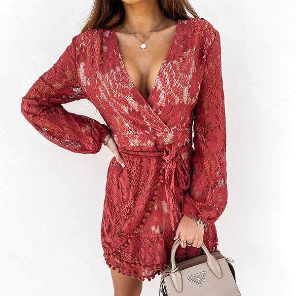 Sexy Deep V-neck Long Sleeve Lace-up Slim Fit Lace Dress