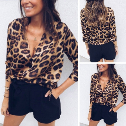 Sexy Deep V-neck Long Sleeve Leopard Printed Top