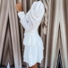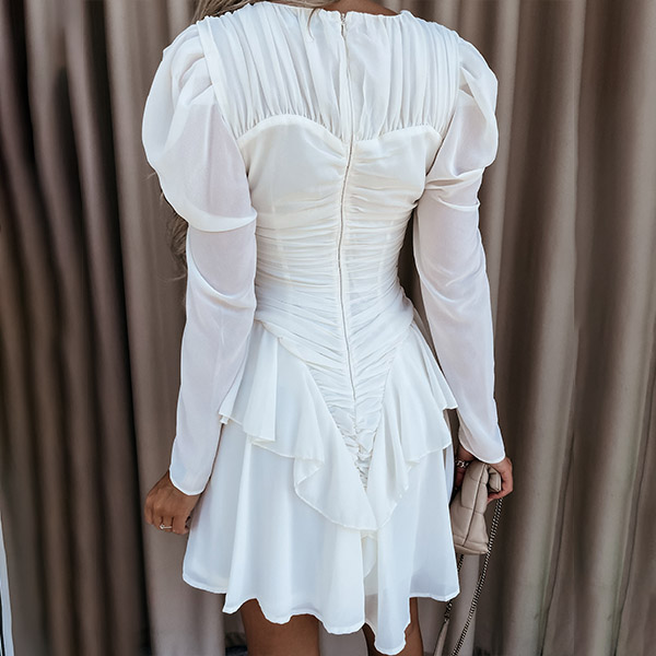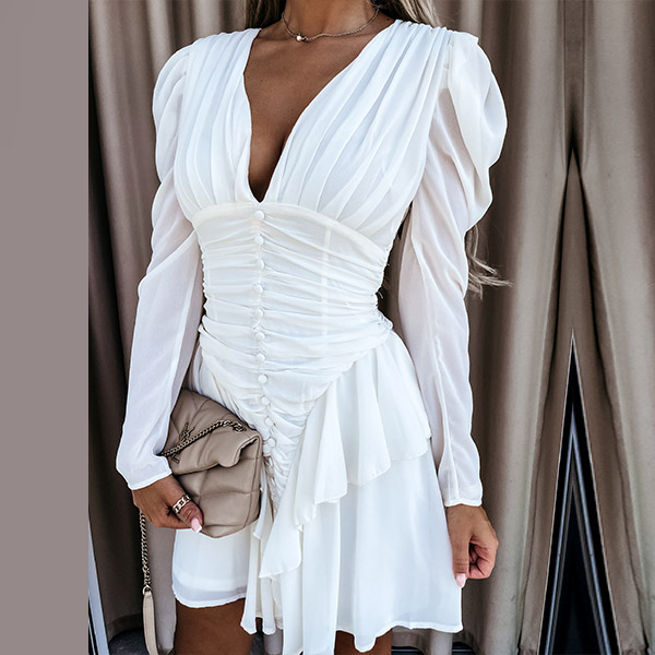 Looking good is never hard for you if you have this dress in your team. Comes with a classic white tone,the deep v-neck and ruffle hem design knows how to exude your sweet yet flirty side,while the gathered waist and fit silhouette design will showcase your slender figure. Attracted? Then invite it to your wardrobe!