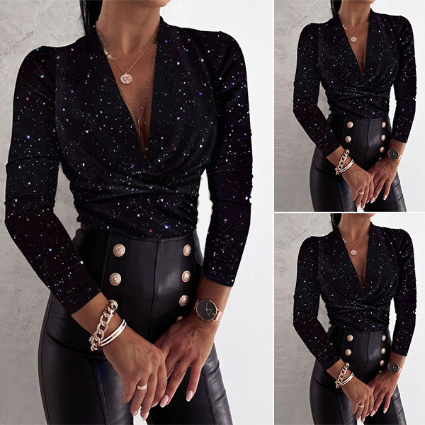 Sexy Deep V-Neck Long Sleeve ShinningTop