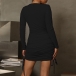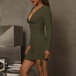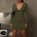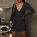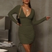 Sexy Deep V-neck Long Sleeve Side-drawstring Solid Color Tight Dress