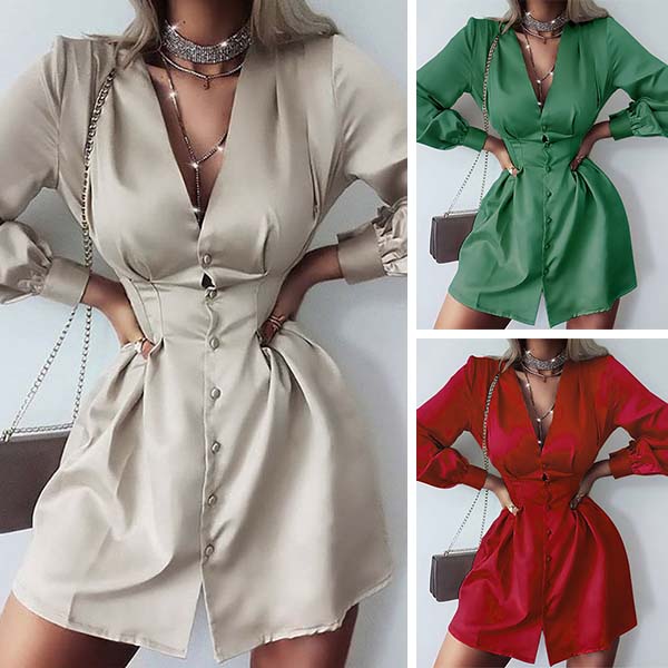 Sexy Deep V-neck Long Sleeve Single-breasted Solid Color Dress