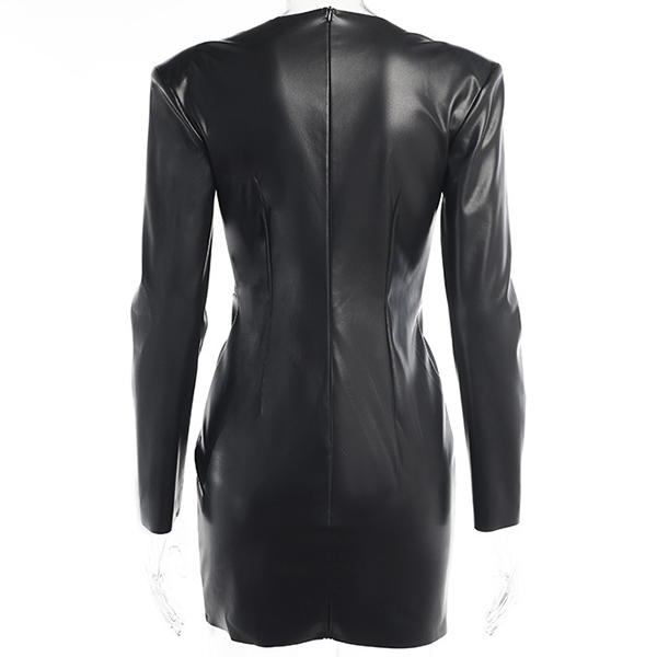 Sexy Deep V-neck Long Sleeve Slim Fit Knitted PU Leather Dress