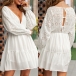 Sexy Deep V-neck Long Sleeve Solid Color Hollow Out Dress