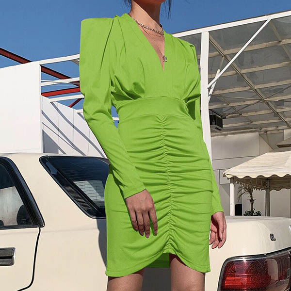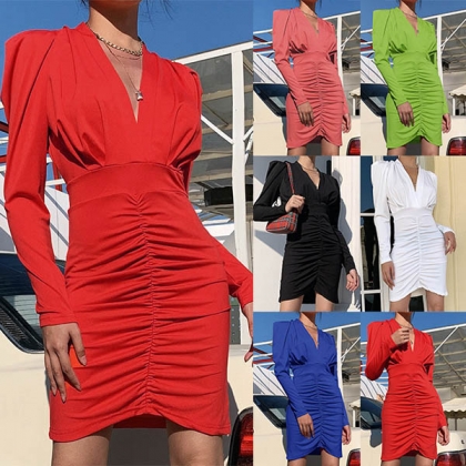 When invited to a dinner date,you can just trust in this dress to express your beauty and charm. Solid color style,the deep v-neck design can enhance your feminine appeal. Finished with long sleeve,an irregular hem and a fit silhouette,this dress can portray your slender figure. Dress it up with your sexy heels for a stunning look!