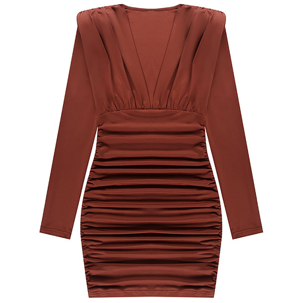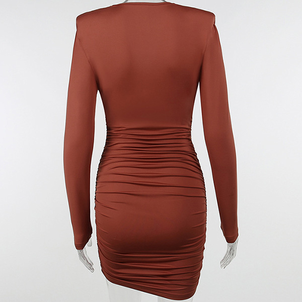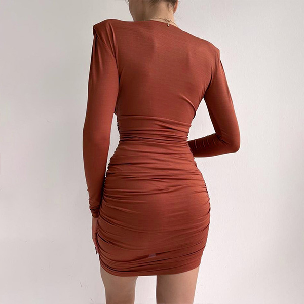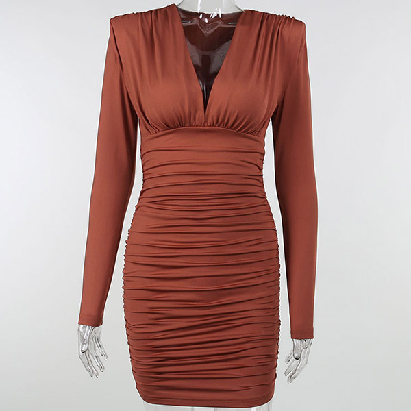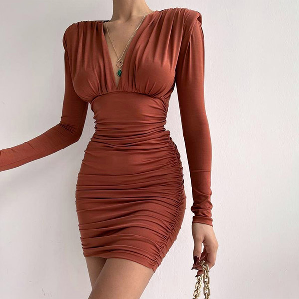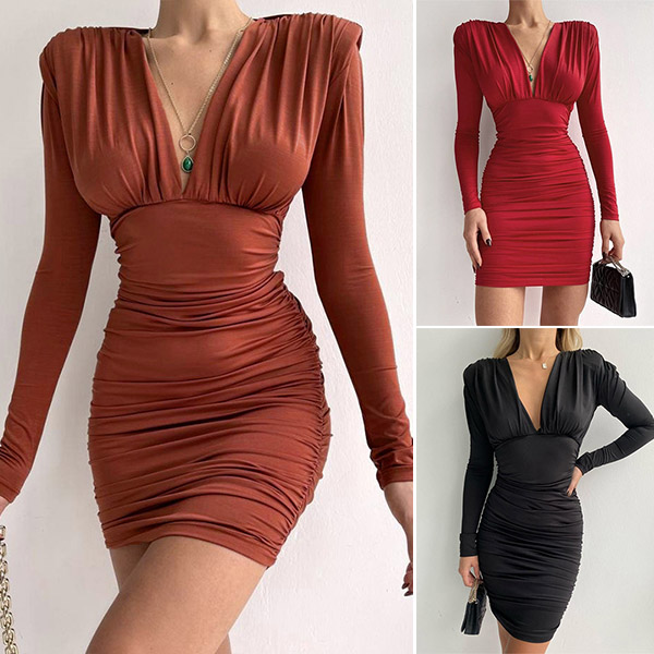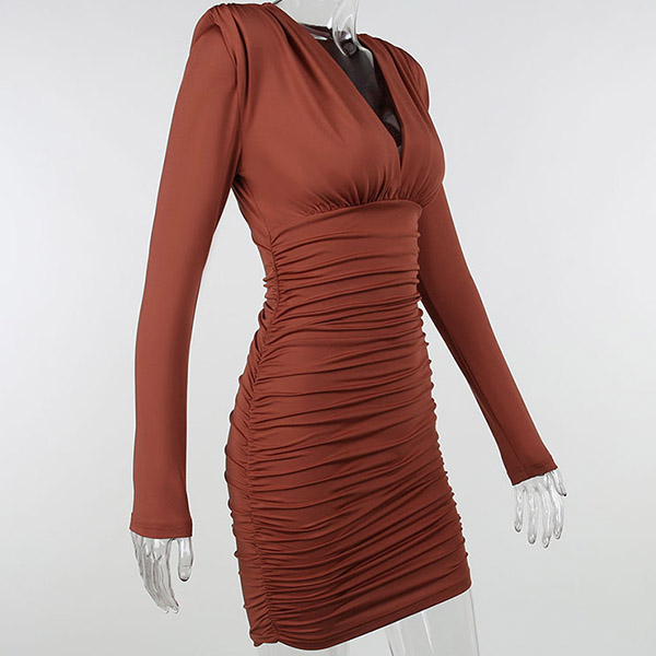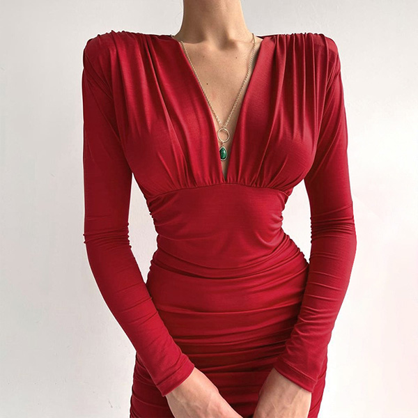Sexy Deep V-neck Long Sleeve Solid Color Slim Fit Wrinkled Dress