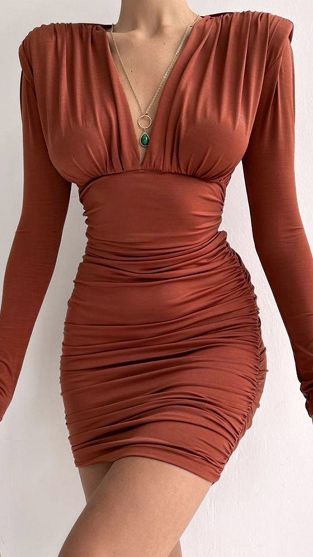 You can exude your sexy and flirty side through this dress. Solid color style,the deep v-neck design and wrinkled details make this piece look so alluring and distinctive,while the tight silhouette design will portray your seductive curve. Dress it up with your sexy heels and elegant clutch for an amazing look!