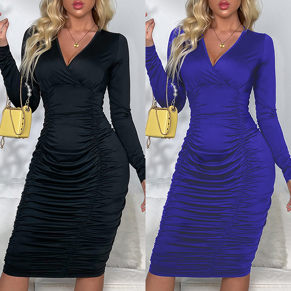 Sexy Deep V-neck Long Sleeve Wrinkled Tight Dress