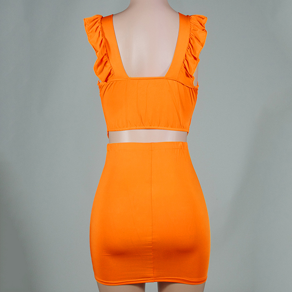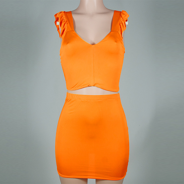 including a sleeveless deep v-neck ruffle crop top and a high waist skirt,this two-piece set is perfect for any last-minute invitation.