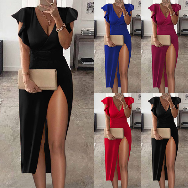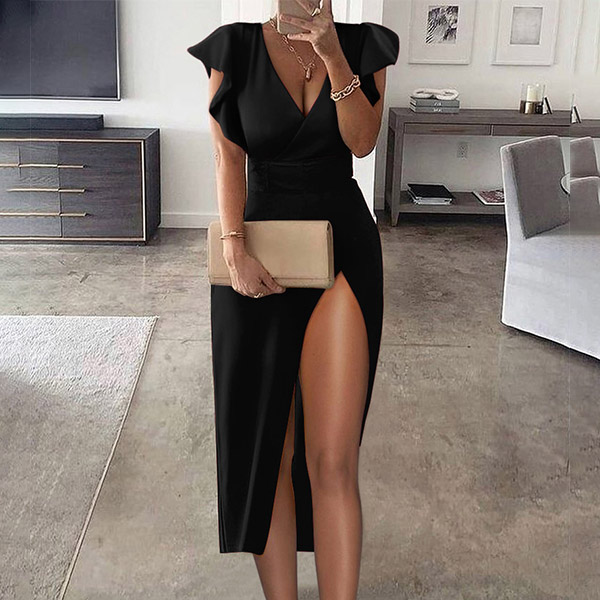 For any last-minute invitation,you can just rest easy if you have this party dress in your team. The deep v-neck,slit hem and ruffle cuff design make this piece full of flirty and sexy vibes,while the high waist and fit silhouette design can showcase your slender figure. So why not dress it up with your sexy heels and elegant clutch for a stunning and beautiful look!
