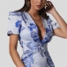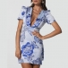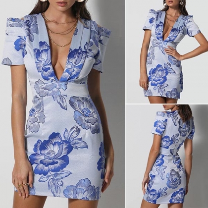 Sexy Deep V-neck Short Sleeve High Waist Slim Fit Printed Dress