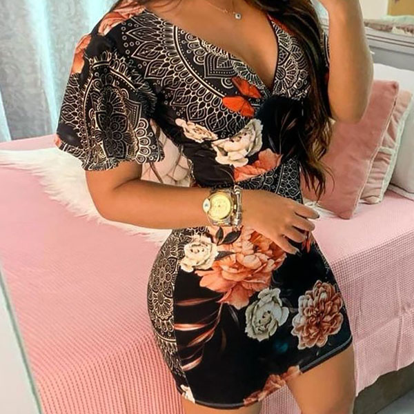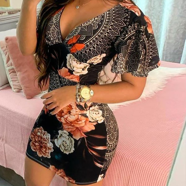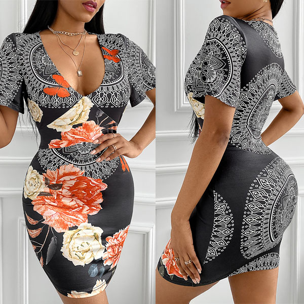 Sexy Deep V-neck Short Sleeve Slim Fit Printed Dress