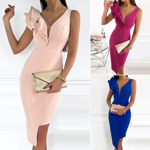 A last-minute party sparking your "I have nothing to wear" stress? Your worries will go out of the window with this dress. The deep v-neck,irregular hem and ruffle design at the shoulder part will make this piece look more alluring and stunning. Paired with your sexy heels and elegant clutch,you can't be more amazing!
