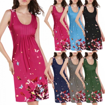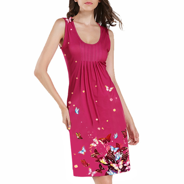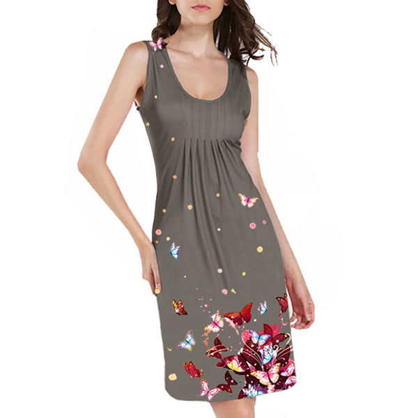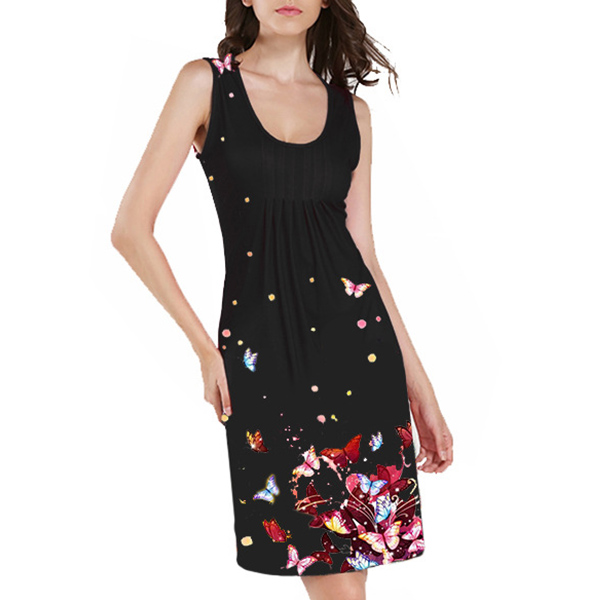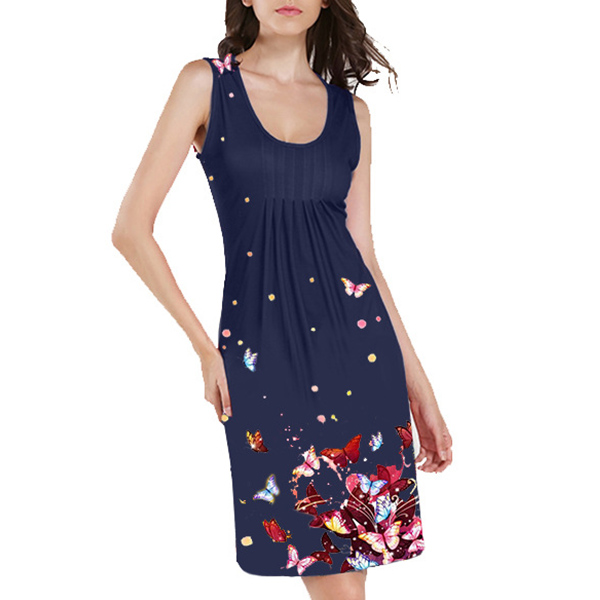 contrast color and sleeveless,simple and concise.The printed pattern is the highlight of the dress,