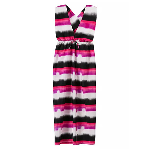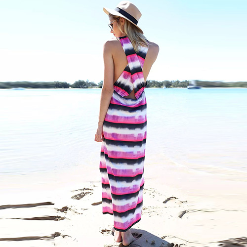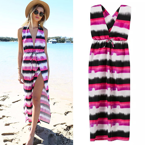 This dress features colorful striped style,with deep v-neck and slit hemline design,sexy and charming.