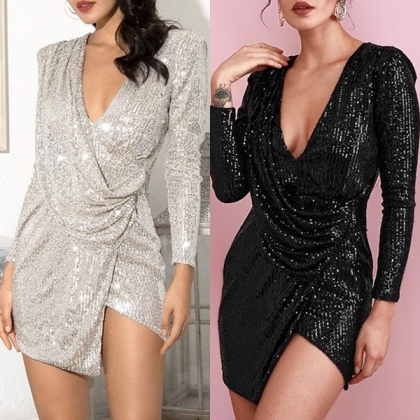 Sexy Deep V-neck Slit Hem Long Sleeve Slim Fit Sequin Dress