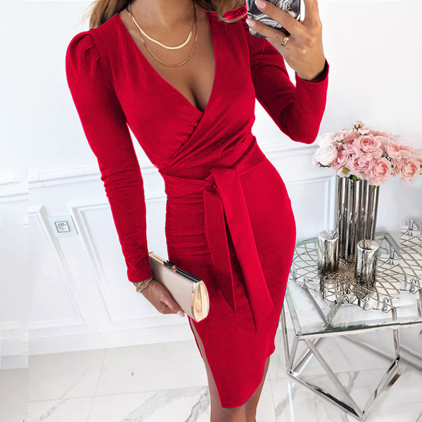 Wanna catch more eyes? Then you can slip into this long sleeve dress. The deep v-neck and slit hem design can offer you a more alluring look,while the fit silhouette and tight silhouette design can better flaunt off your seductive curve. Dress it up with your sexy heels,sparkle necklace and elegant clutch,you can look beautiful enough!