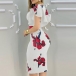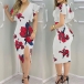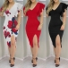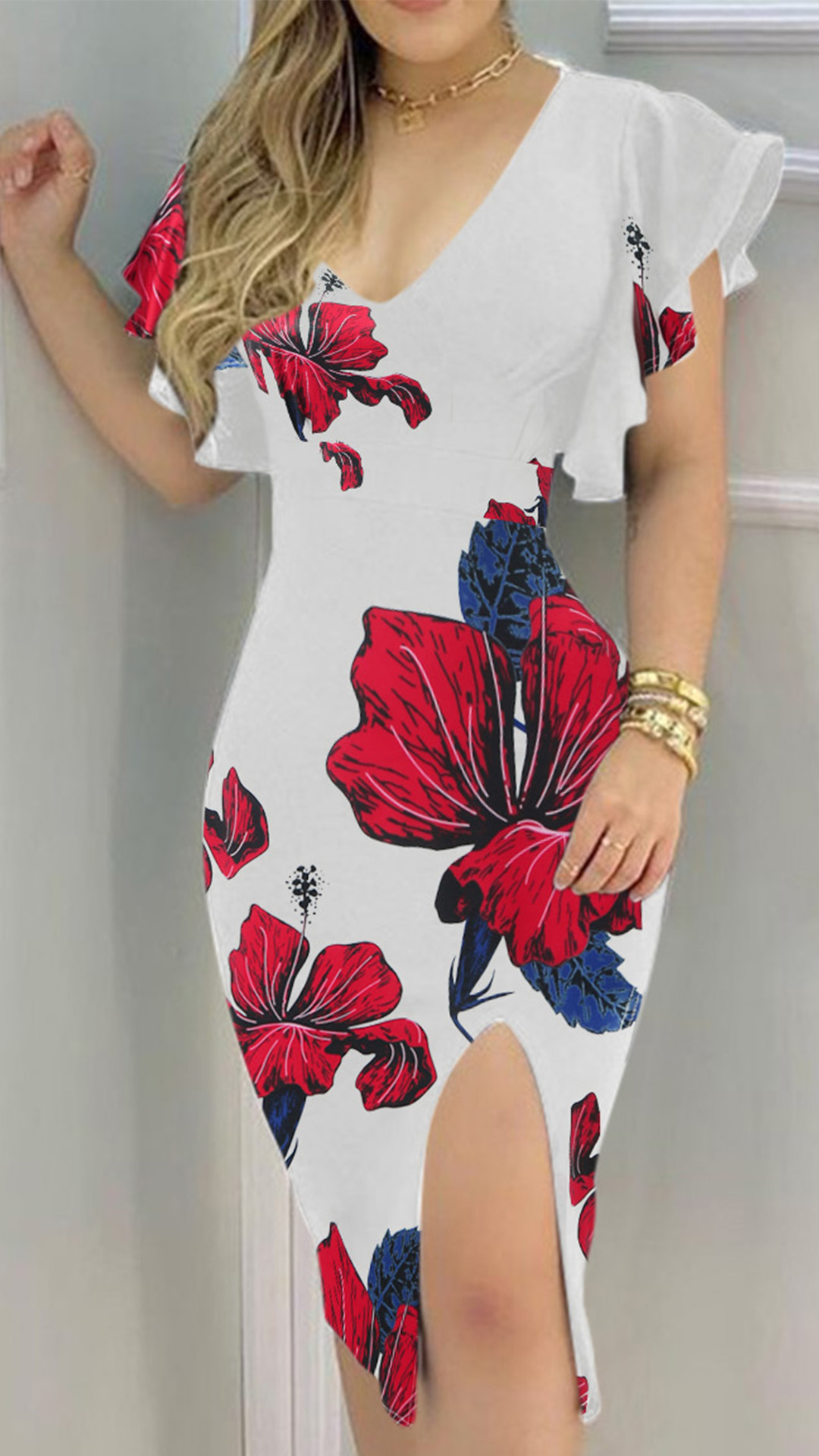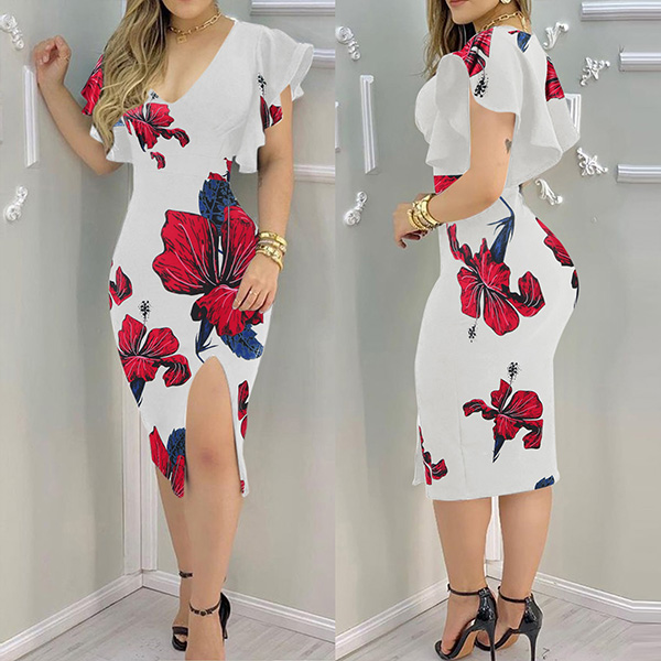 Sexy Deep V-neck Slit Hem Ruffle Cuff Slim Fit Dress