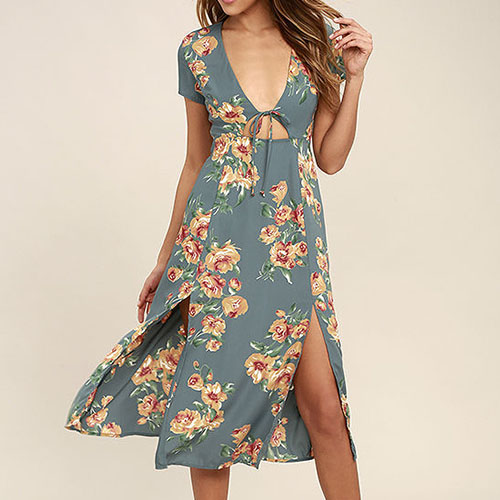 Boasts vibrant floral print,its deep v-neck and slit hem design makes this piece more charming and sexy. This sultry dress is