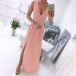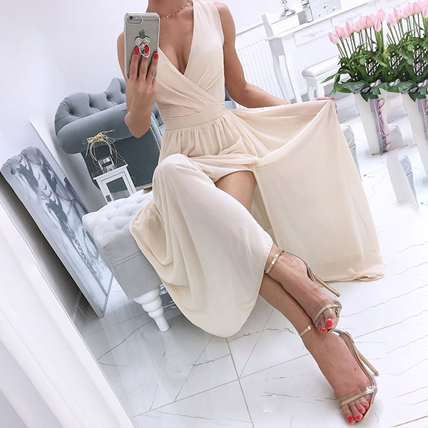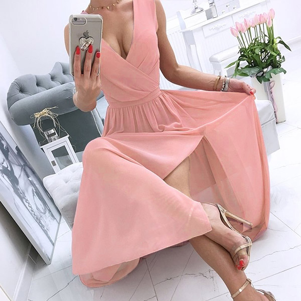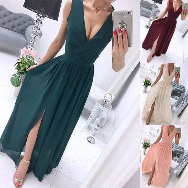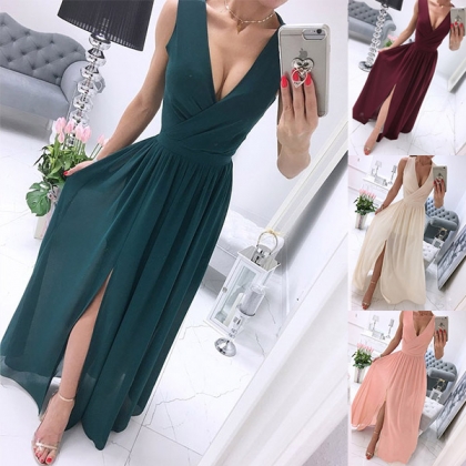 Outfitted with the features of sexy and charming and rendered into a more flattering and feminine design, this dress is the key to an effortlessly chic and sultry look. Solid color style,the deep v-neck and slit hem design will make you look more alluring,while the high waist design can showcase your slender figure. When invited to some fancy events,this little stunner can easily strike your mind.