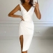 This effortless flirty and sassy dress is perfect for any last-minute invitation. Solid color tone design makes it look generous and elegant,while the deep v-neck and slit hem design can make your look full of alluring sense. With the clean,fit silhouette design,your slender figure also can have a full display in this dress. When invited to some fancy events,you can trust in this dress to express yourself.