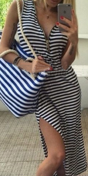 Sexy Deep V-neck Slit Hem Sleeveless Striped Dress