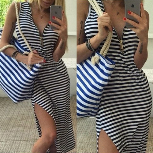This dress features striped style,with sleeveless,deep v-neck and slit hem design,with cozy,sexy and