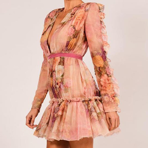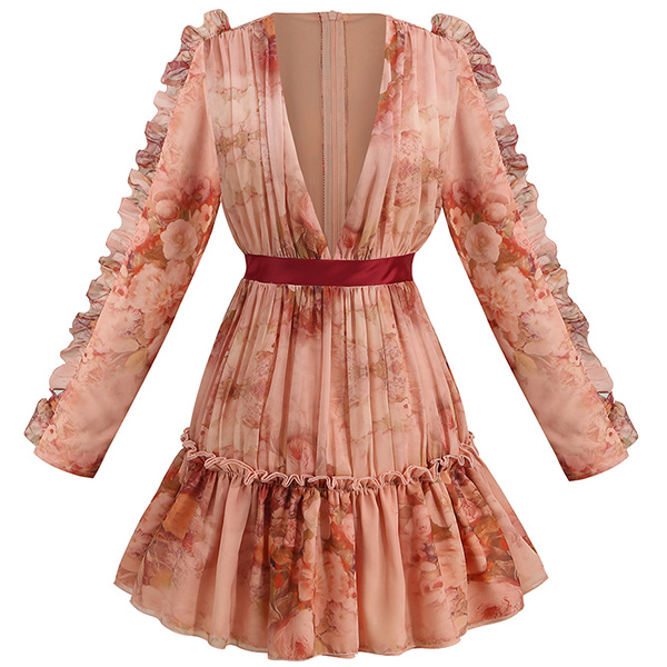 Sexy Deep V-nekc Long Sleeve Ruffle Hem Slim Fit Printed Dress