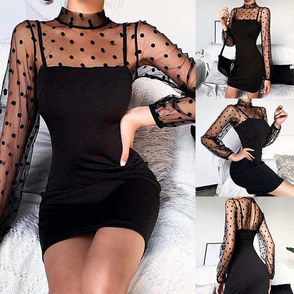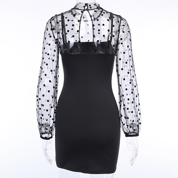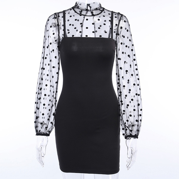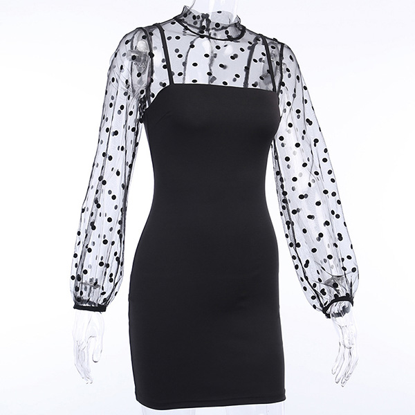 Sexy Dots Gauze Spliced Long Sleeve Mock Neck Slim Fit Dress