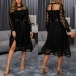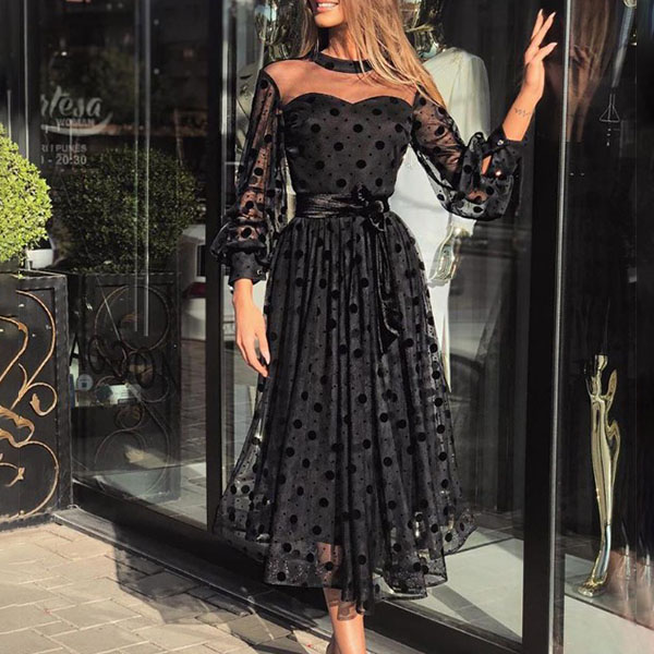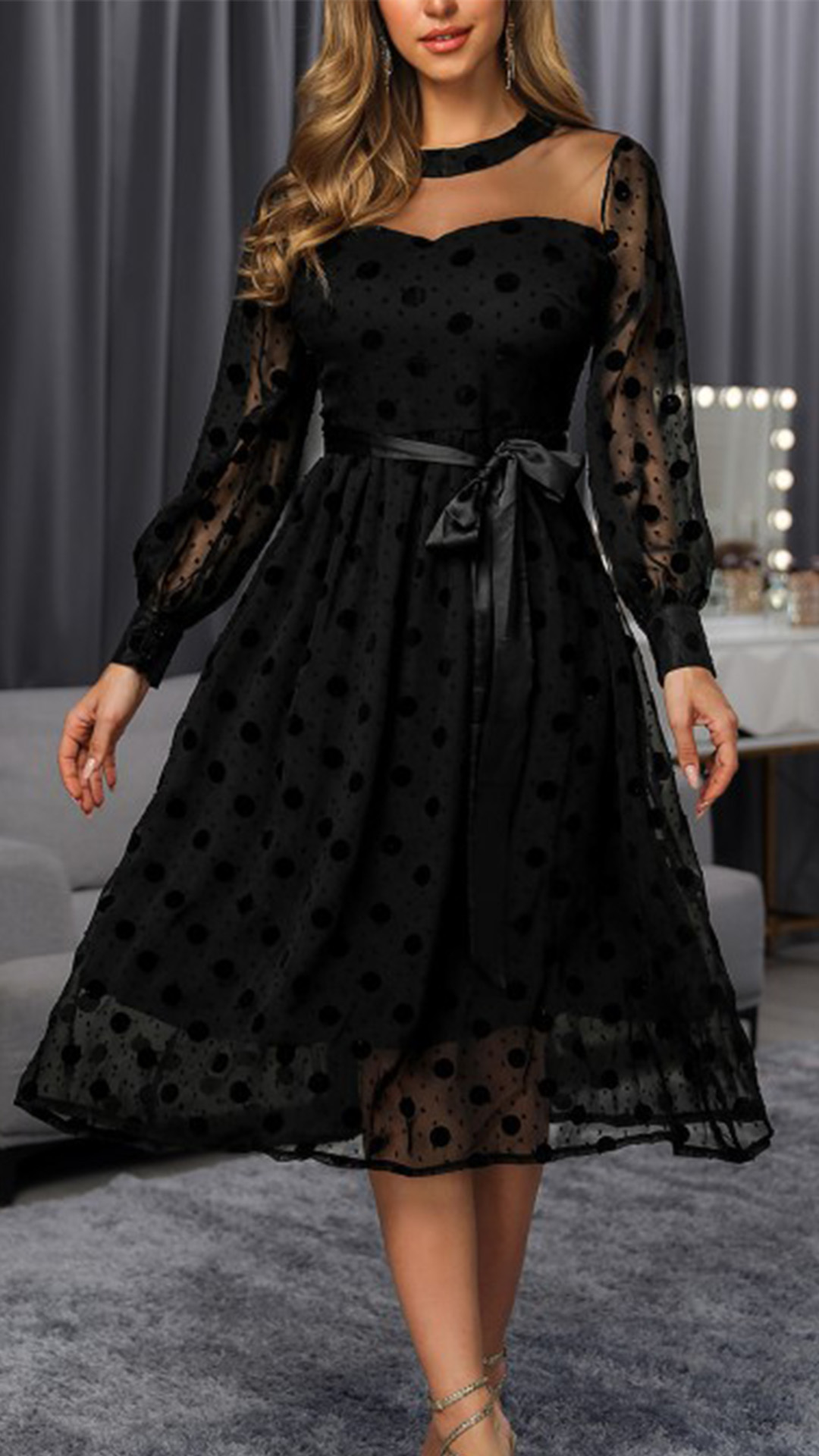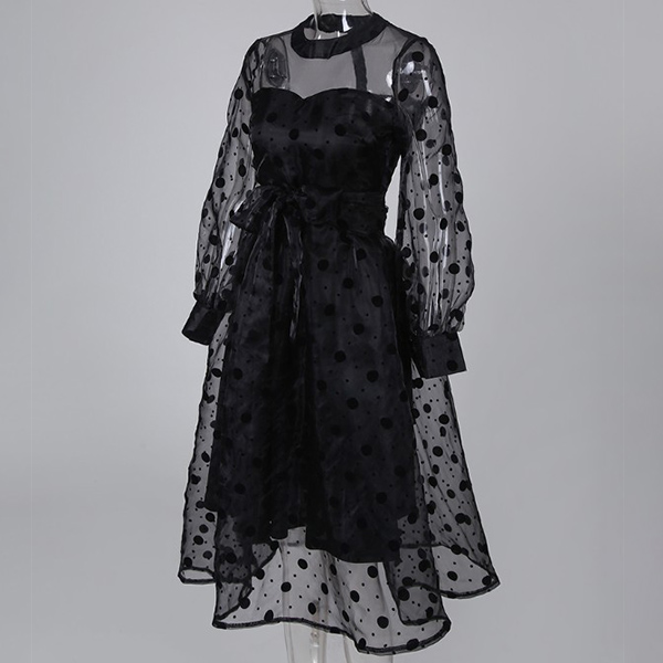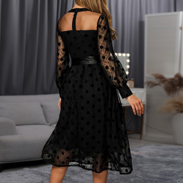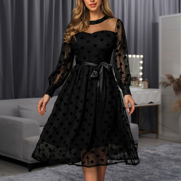Sexy Dots Gauze Spliced Long Sleeve Round Neck High Waist Party Dress