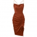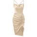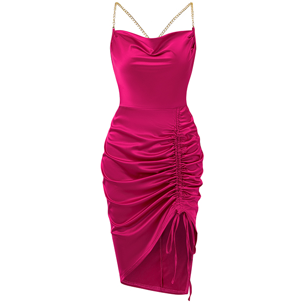 This sexy dress combines a draped neckline, drawstring details for a ruched effect, a backless design, and a bodycon silhouette and chain shoulder strap for a captivating and sexy look.