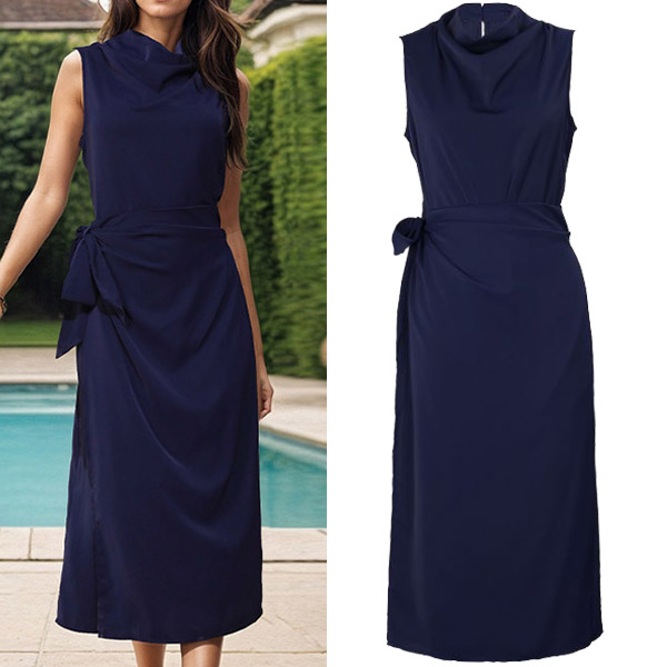 This wrap dress features a seductive draped neckline, sleeveless design, and a self-tie wrap detail, combining elegance with a touch of allure for a captivating and stylish ensemble. Wanna have a try?