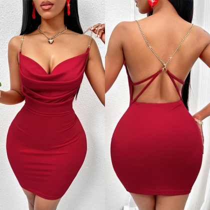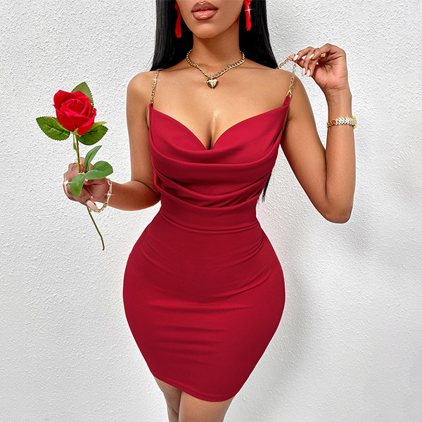 This sexy dress features a draped neckline and ruched design, a bodycon silhouette, a backless style, and chain shoulder strap detailing for a sexy and glamorous look. Wanna have a try?
