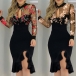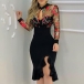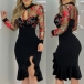 Sexy Embroidery Gauze Spliced Long Sleeve Irregular Ruffle Hem Slim Fit Party Dress