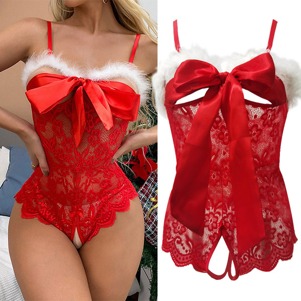 Sexy Faux Fur Lace Spliced Sling Bow-knot Bodysuit Lingerie