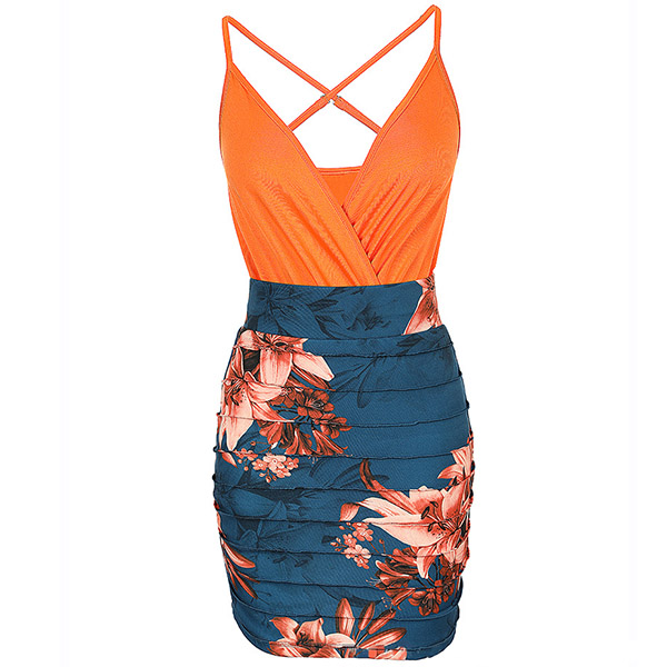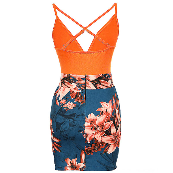 Sexy Floal Printed Two-piece Consist of Solid Color Bodysuit and Floral Printed Skirt