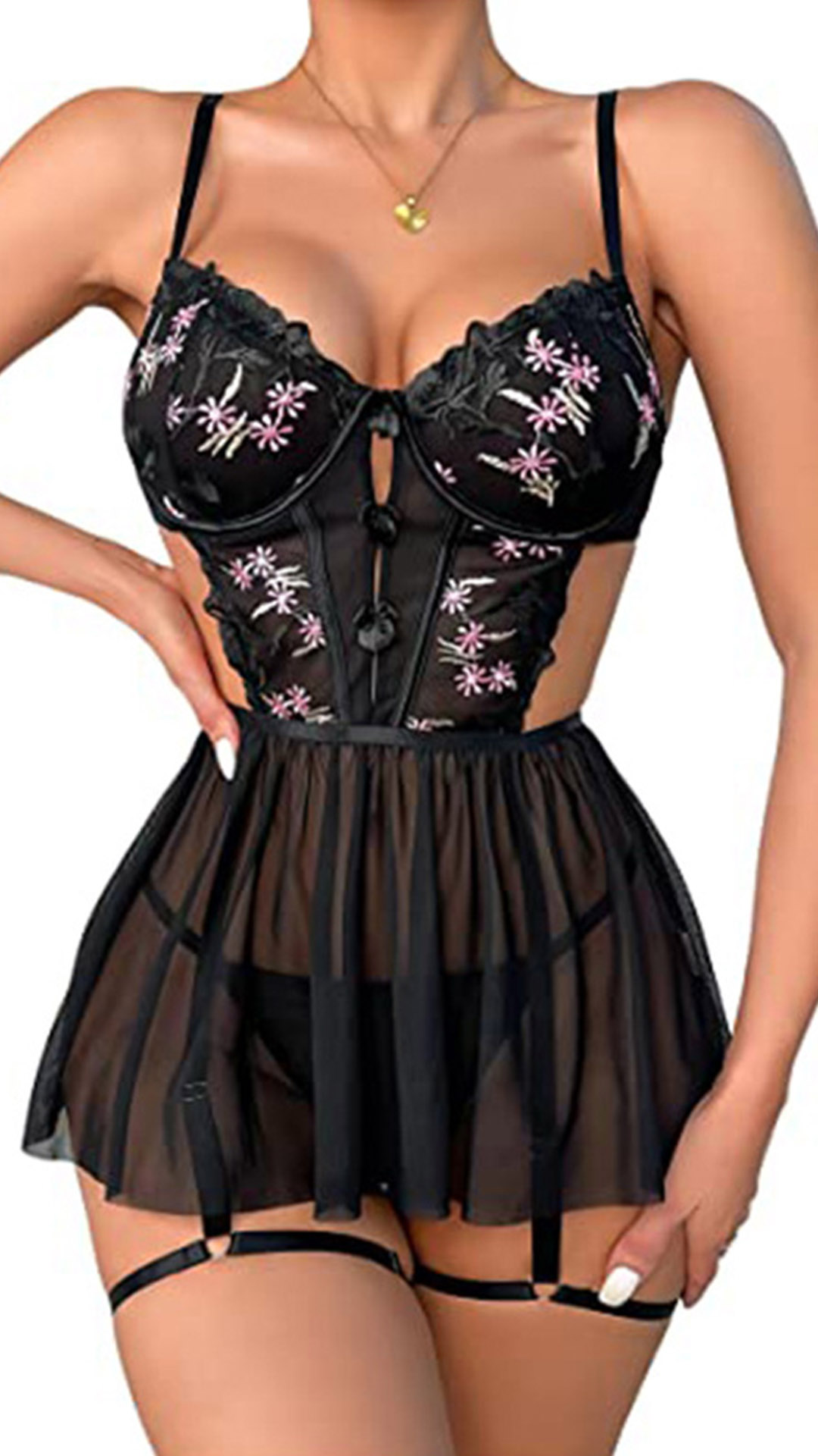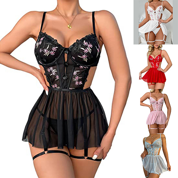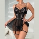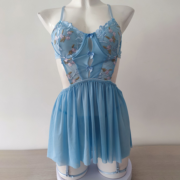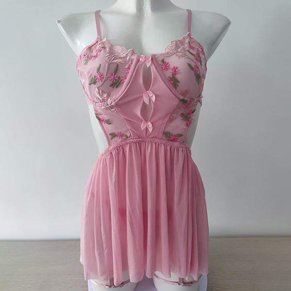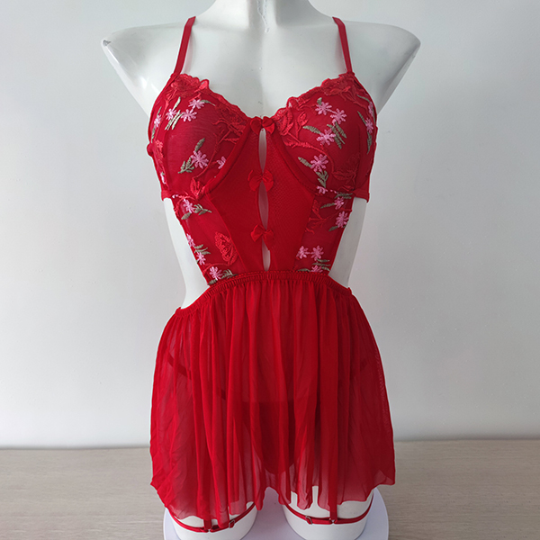 Sexy Floral Embroidered V-neck Gauze Spliced Backless Pajamas Dress