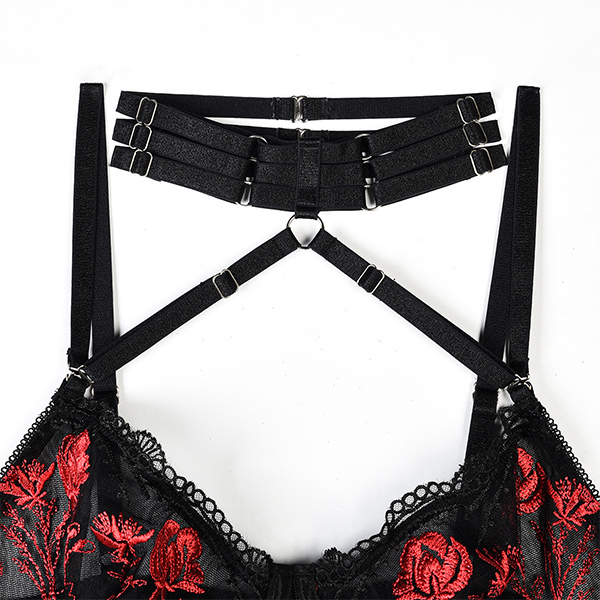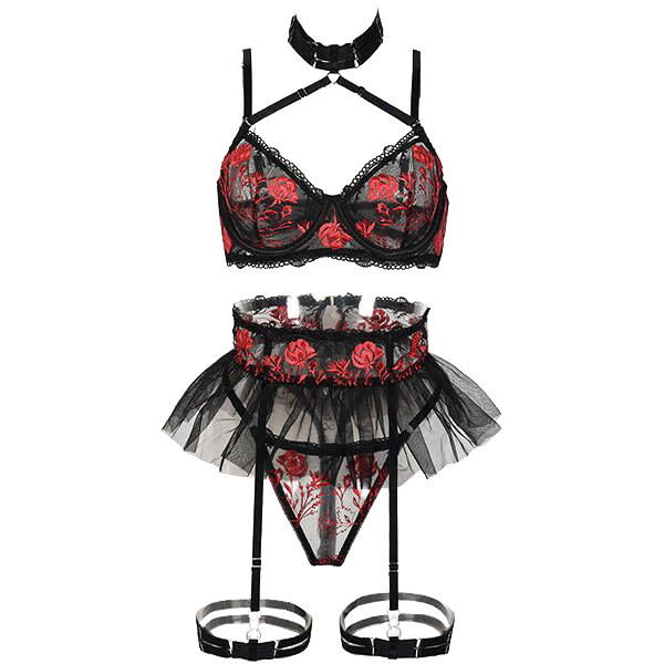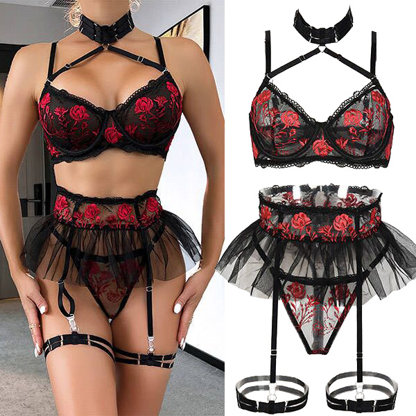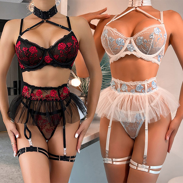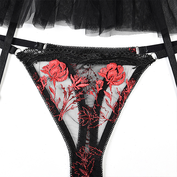 Sexy Floral Embroidery Gauze Spliced Ruffled Four-pieces Lingerie Set