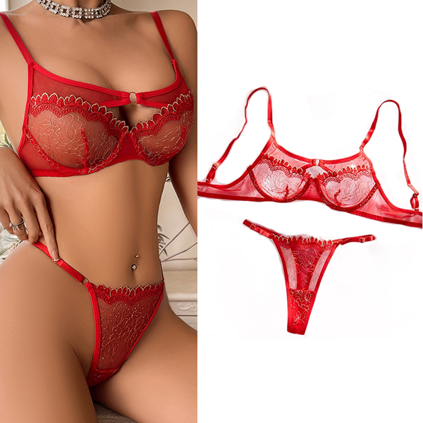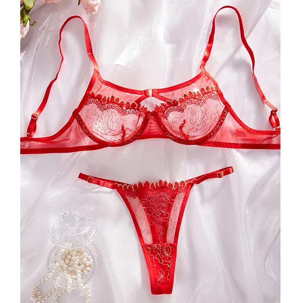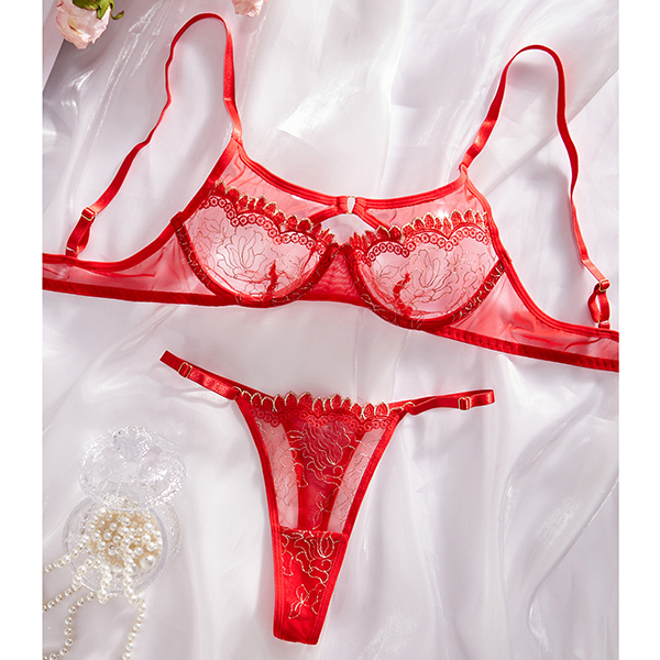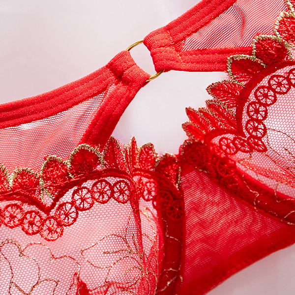 Sexy Floral Embroidery O-ring Semi-through Two-piece Lingerie Set