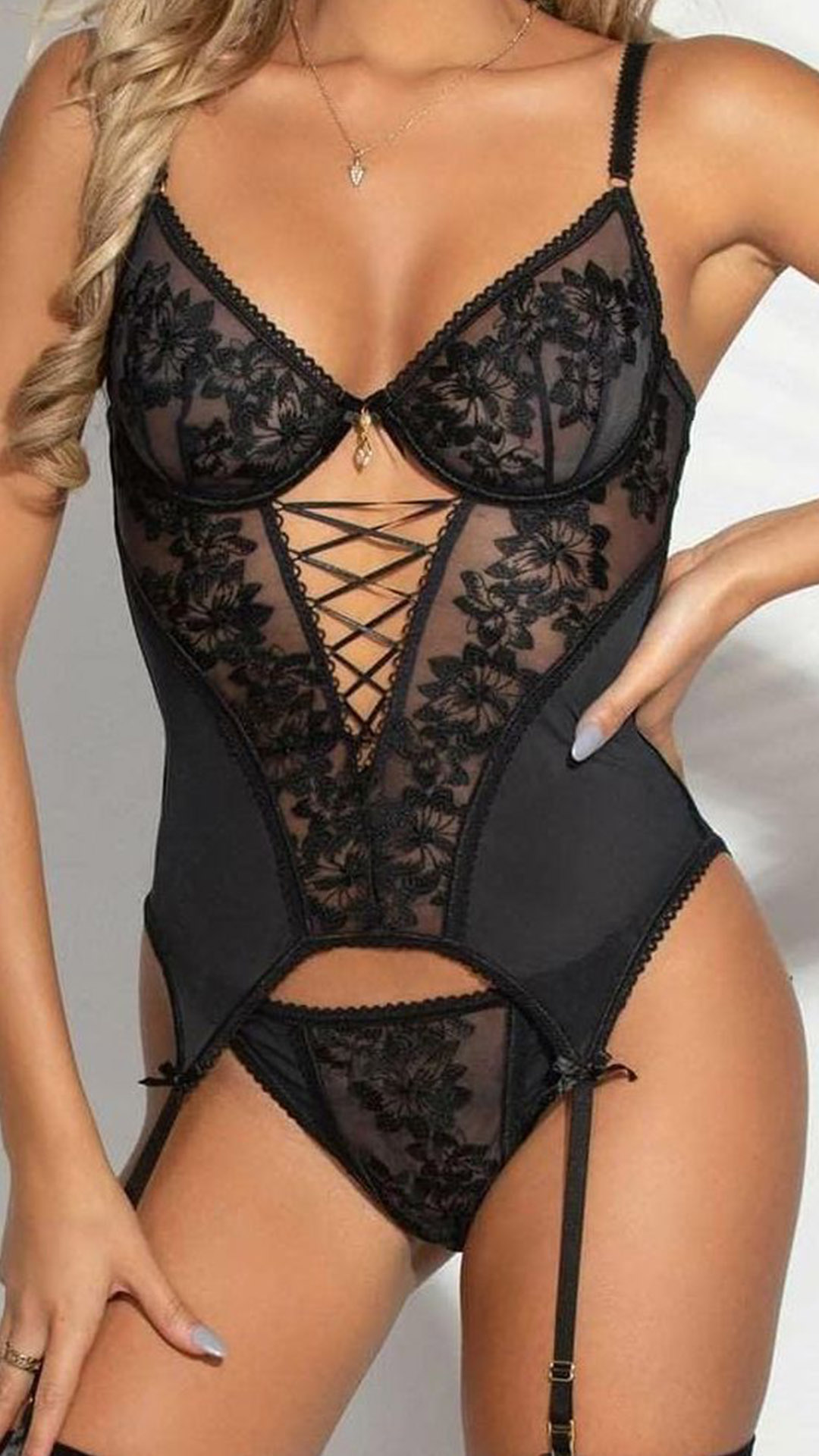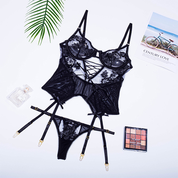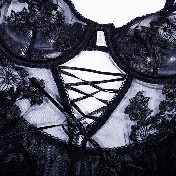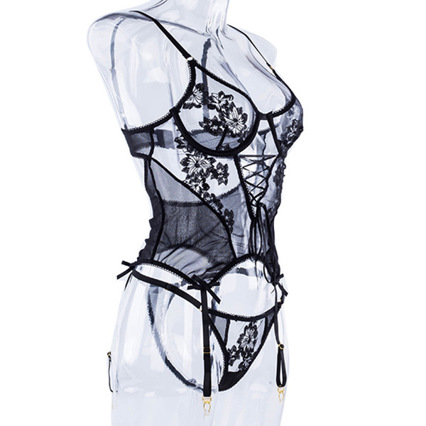Sexy Floral Embroidery Semi-through Gauze Spliced Two-piece Lingerie Set