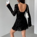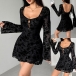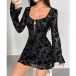 Sexy Floral Jacquard Square Neck Long Sleeve Front Cutout Bowknot Mini Dress
