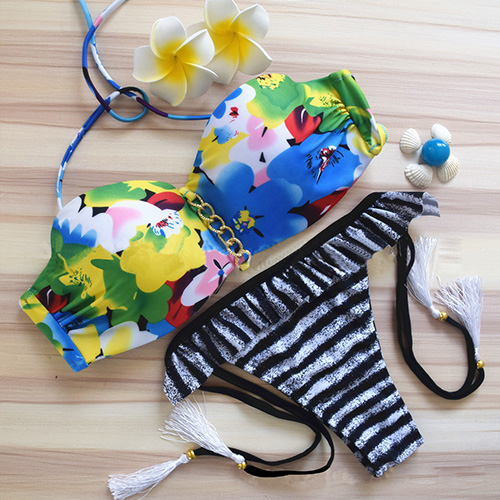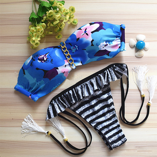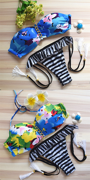 Including a floral print bra and a striped triangle pants. Adjustable neck and back strap