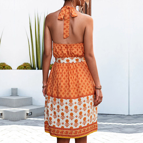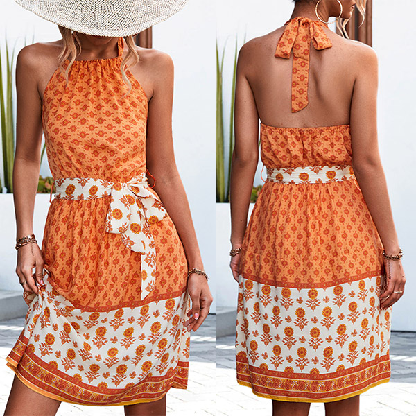 Sexy Floral Printed Halter Neck Self-tie Mini Dress