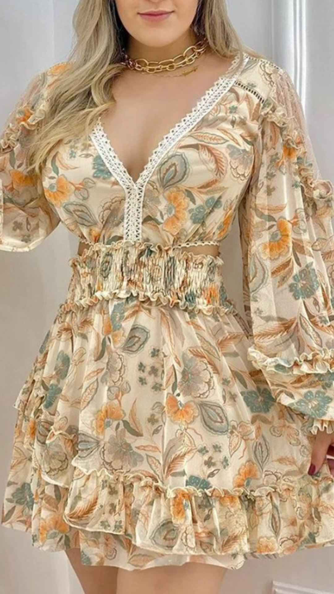 This pretty dress features a floral print throughout, with lace splicing along the V-neck, and cut out details at the waist for a sexy look! Long sleeve with ruffled details and the tiered skirt with ruffle details, sexy and sublime!