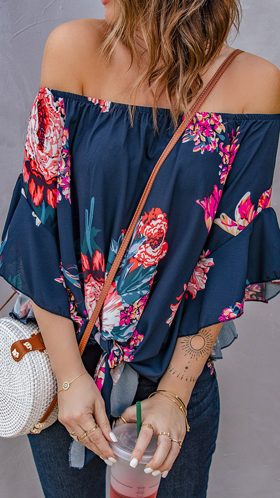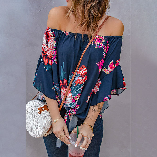 Sexy shirt featuring overall floral printed, off-the-shoulder, elbow sleeve, self-tie knot hemline design, is it your style?