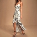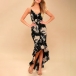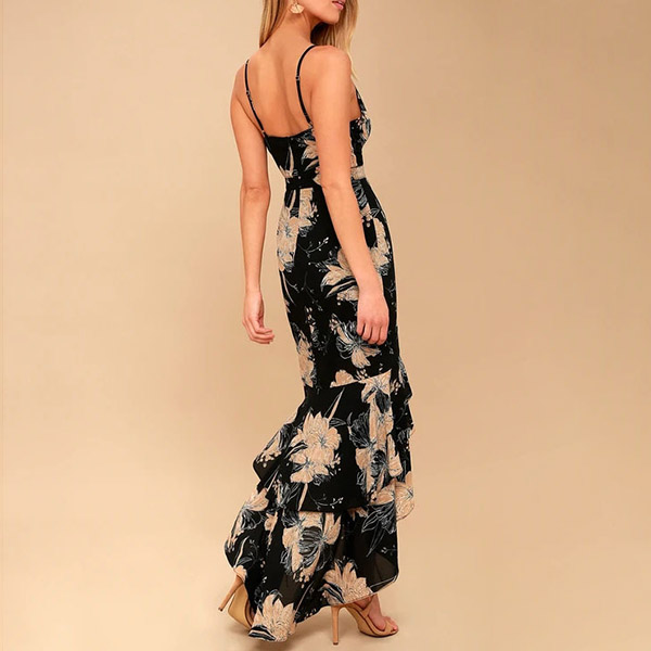 This is a beautiful and sexy floral printed dress with a ruffle high-low hemline. It is perfect for any special occasion, party, or night out.